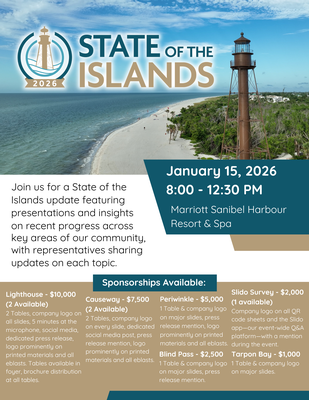 The SanCap Chamber hosts its third annual breakfast presentation on the State of the Islands 2026 from 8 a.m. to 12:30 p.m., Thursday, Jan. 15, at the Marriott Sanibel Harbour Resort & Spa in Fort Myers. The presentation will highlight recent progress made in several fields, featuring representatives on each topic. Doors and registration open for the event at 7:30 a.m. Breakfast commences at 8:30, and the program at 9.